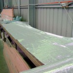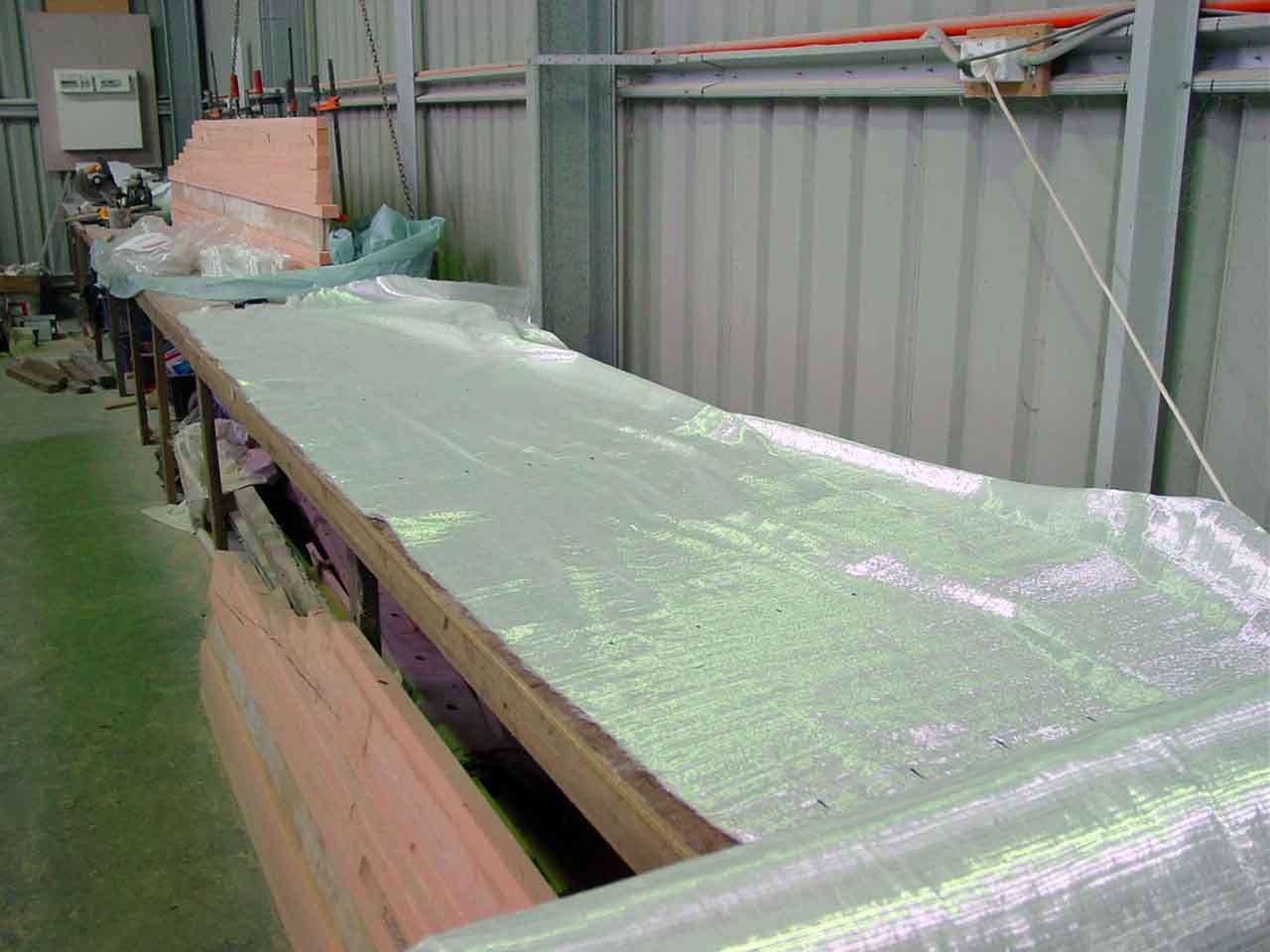 Then I set about cutting the uni strips for the spine and the sides of the boards. The plans call for 7 layers of 450g uni each side of the 120mm spine. I have a roll of 100mm uni but it wont do, so I pulled the full width roll of uni out (1300mm) and I cut off 3700mm (length of dagger blanks) then stripped it down into 120mm lengths which I then rolled up. Once I had cut 14 strips I cut the lengths of glass for the outside of the dagger (2 layers with threads up the board, 1 layer with threads across the board) and I put the roll away.