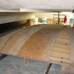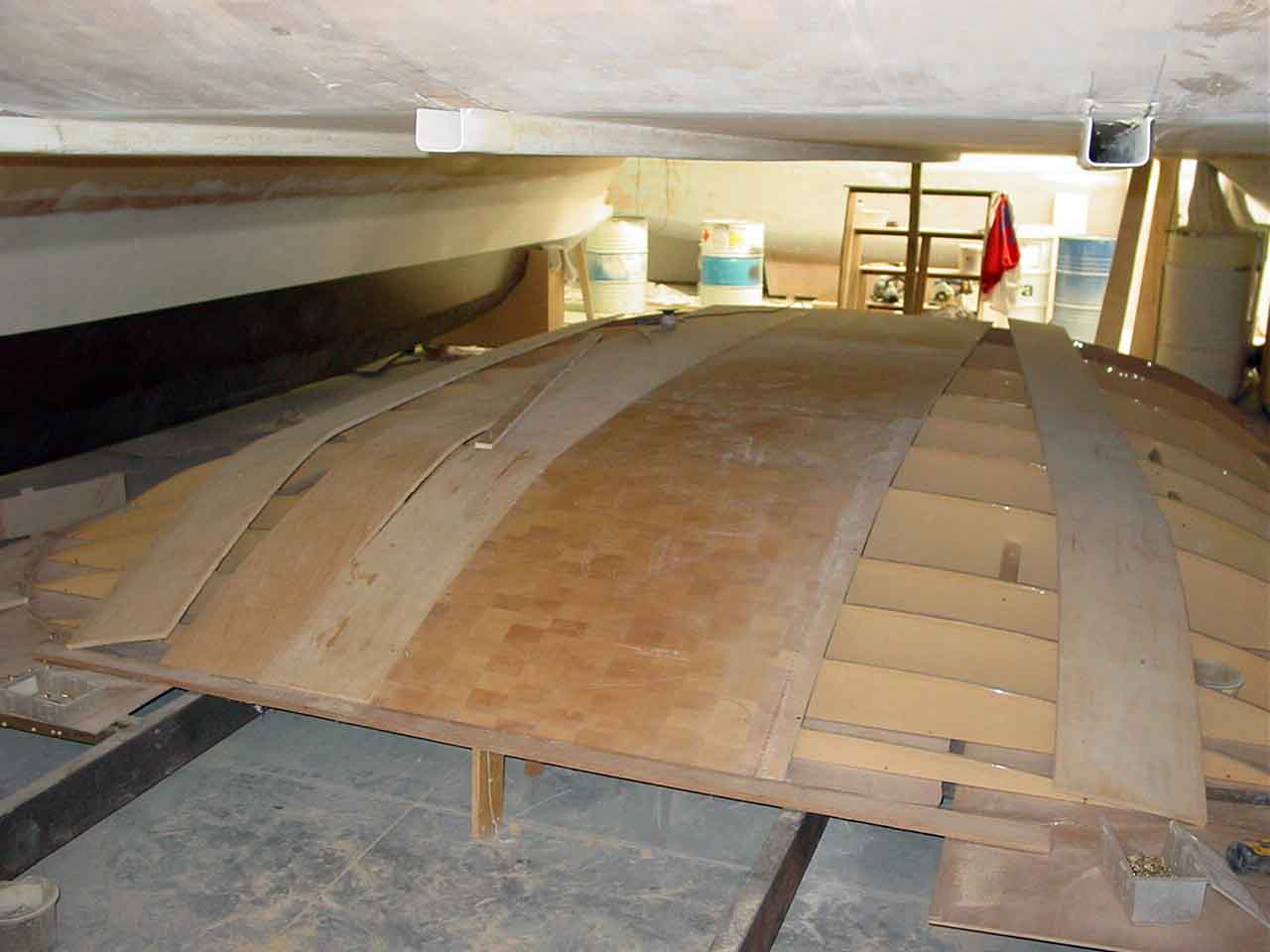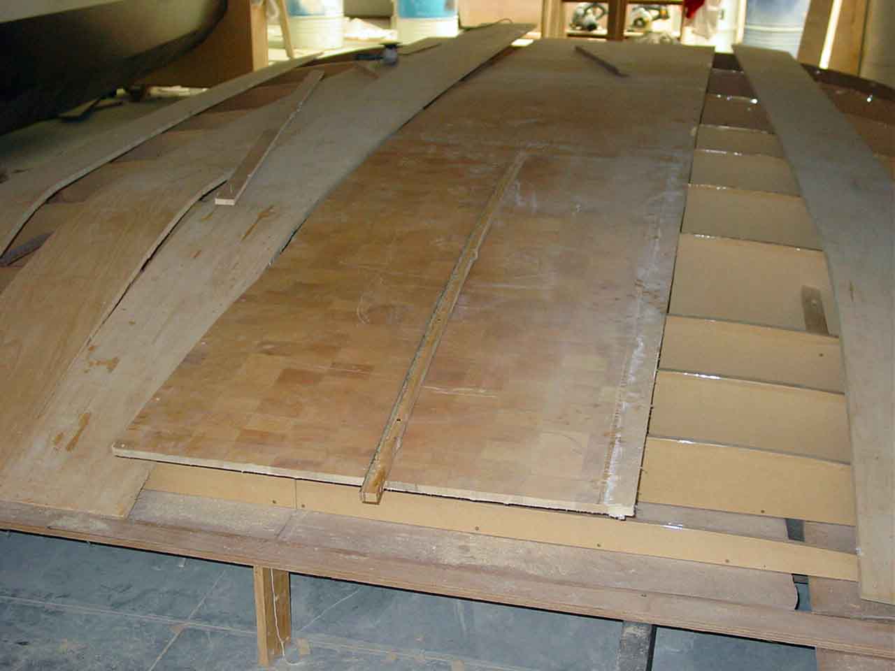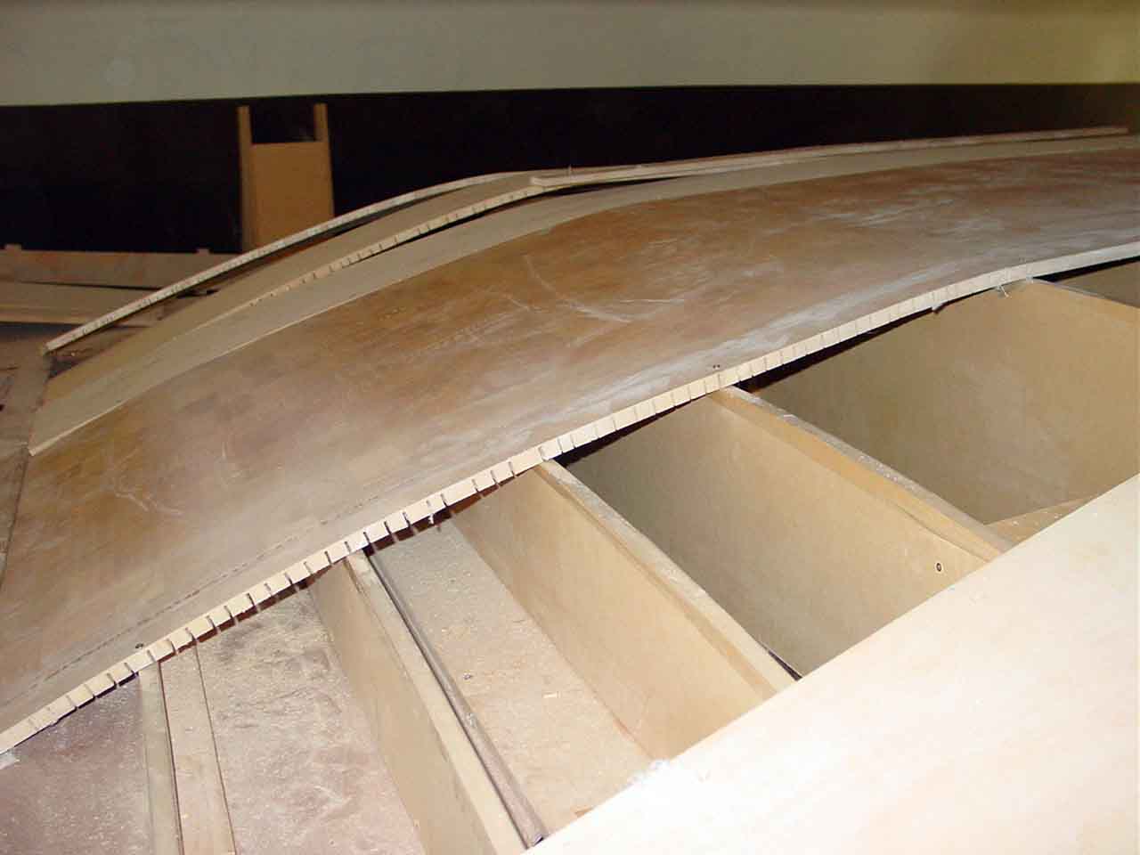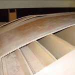 Now that I am at the sides where the curve down gets more acute I will have to cut the remaining duracore planks into strips and to strip the rest of the duflex offcuts into strips and strip plank the roof in the same way I did the hull to deck curves.