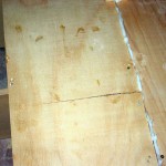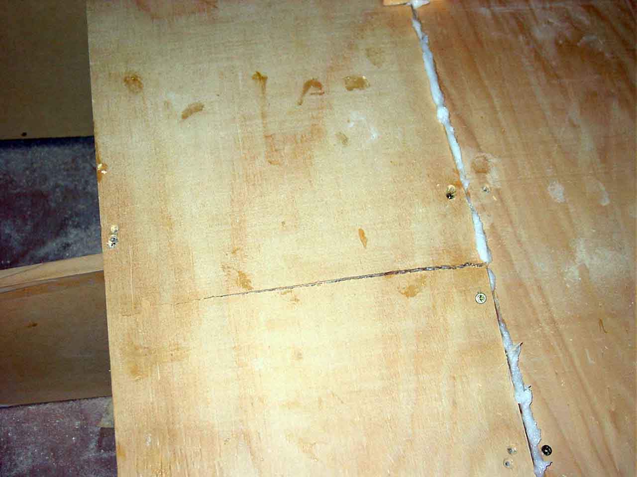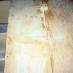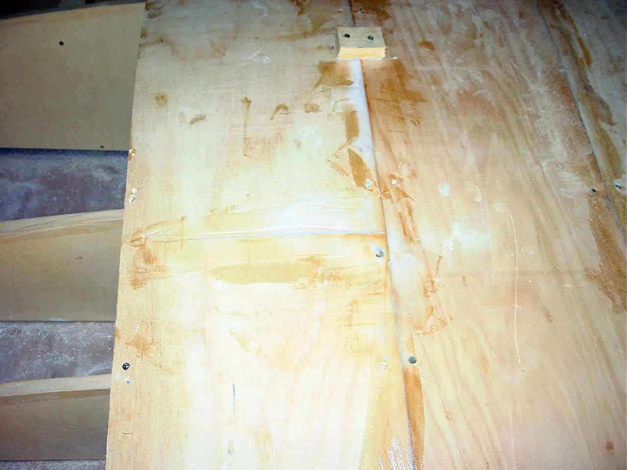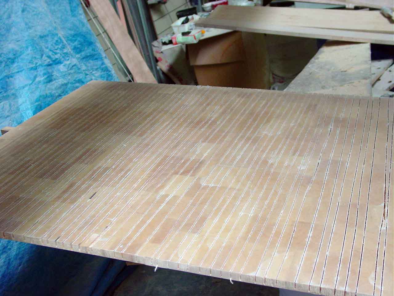 What I did get done was to plank a little over half the roof from the centre out each side. The roof is about 4.8 meters wide and I have about a meter to do each side. I started by cutting the excess duflex off on one side to make it a parallel plank. I then kerfed the panel, in the end I probably over did it on the kerfs. When I dry fitted the panel it wanted to sag between some of the frames and I had to use the duracore planks either side to keep the shape. I also had a pine brace on the back to stop the kerfs from folding forward and snapping at the glass. The space under the boat is not quite enough to turn the 1 meter wide panel over (I need it upside down to apply the glue to the kerfs) and almost cut it in half but decided to go ahead with it in one piece and I am glad I did, I had room to pull it forward to turn over, I filled the kerfs with glue, turned it back over and attached it to the frames. I left one of the duracore planks attached so that I could butt up against it to ensure it went on square and to regain the correct kerf shape where the duflex wanted to sag a little, using pine tabs to pull it up or push it down flush where needed. I have also taken out most of the hard turn with deeper kerfs but that comes with its own problems as occurred later on a duracore plank. I had filled the kerfs with glue and had turned it over and placed it on the frames but with only a mm of balsa the pine veneer tore under the plank weight and almost completely broke in half, a nightmare to fix as it causes a hard turn at the break. But because it had just hung on and I caught it before it completely broke I was able to gently fix it in place and back fill the tear with glue and get some long screws from the panel along side into it to hold the curve shape while it sets.