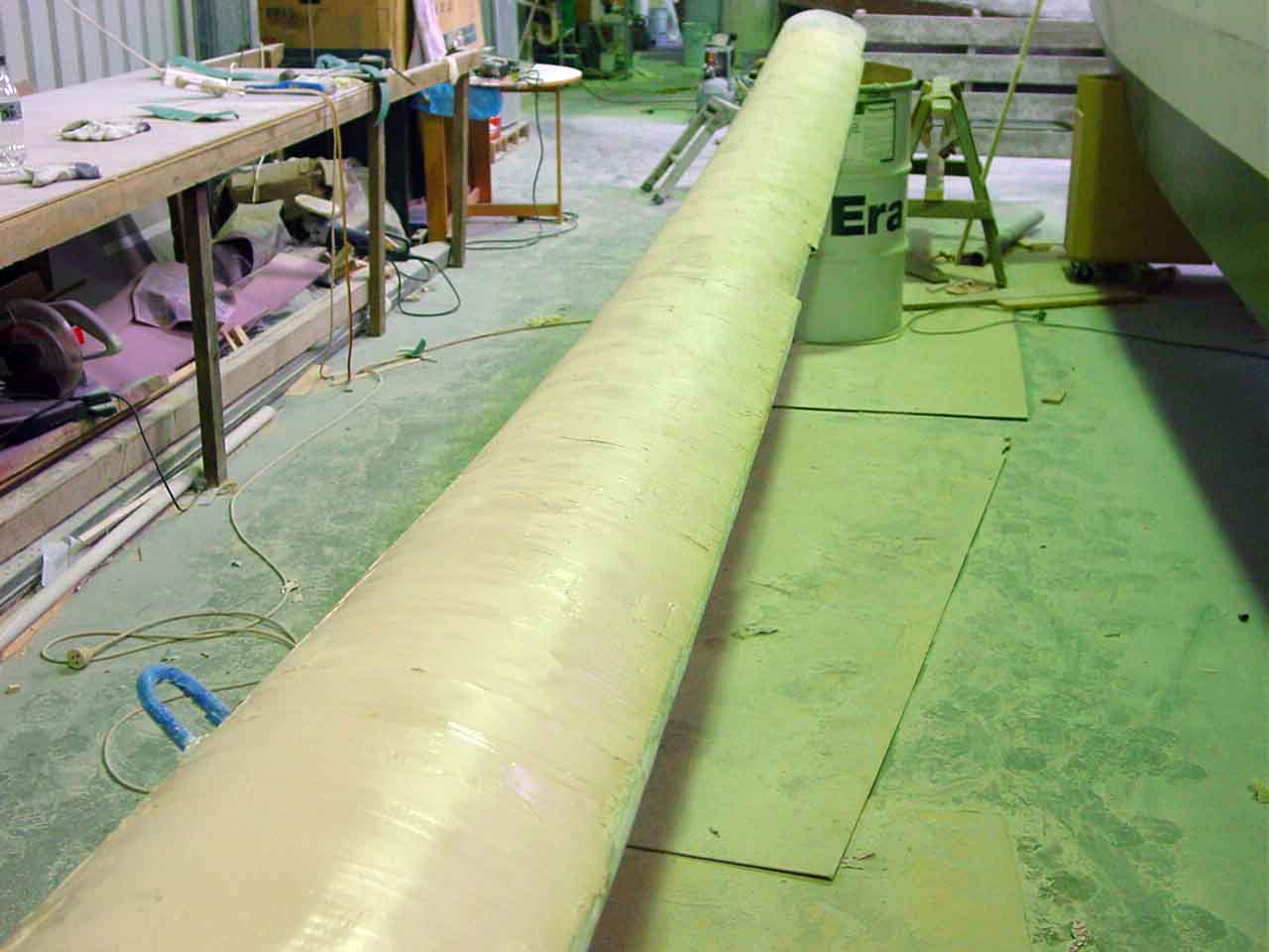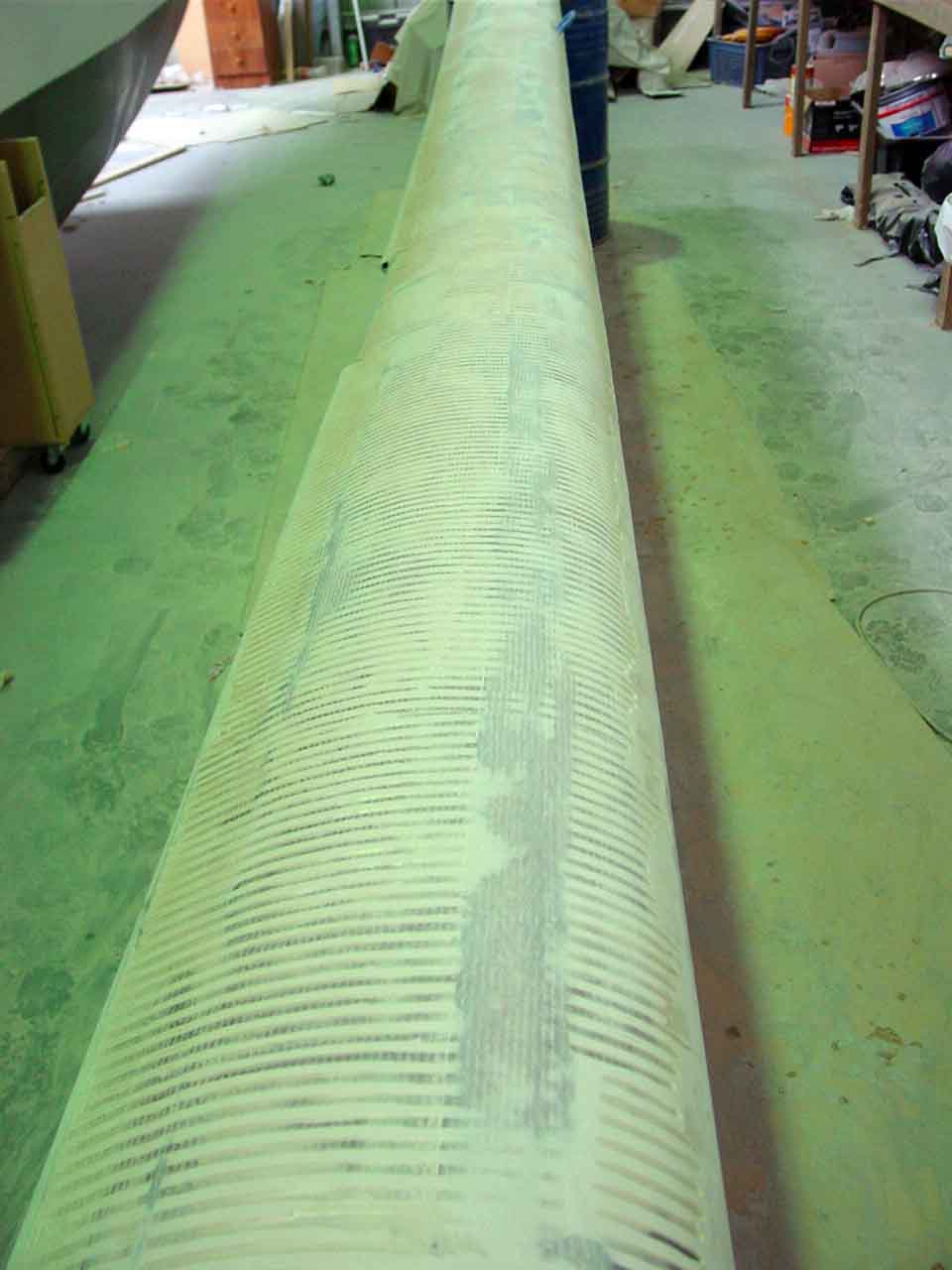 When I glassed the beam I had the glass layers overlap on the underside so that any unfairness would be on the least visible side. Now that the beam has had a layer of bog beads applied and then back sanded the overlap line comes into sharp focus. It will of course disappear again once the backfill goes on.