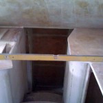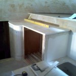 I used the same corner method of the quarter pvc pipe, having been successful on the other side of the stairwell and having done it once, it was very easy to do again and took me a fraction of the time. I started with the kickboard quarter pipe, glassed it in and then the cabinet corner, but because the return for the fridge space is so close to the corner I decided to glass that to the pvc pipe before I glassed the pvc pipe corner into the cabinet. This gave me a face I could clamp to steady the curved panel while the glue and glass set. I made the return out of 25mm ply so that it was strong and thick enough to screw into to secure the fridge front flange to. Once this corner was set I completed the frame around 3 of the 4 sides by running the same 25mm ply around to create the full frame. I have not done the top of the frame yet as I want to dry fit the fridge first to be absolutely sure I dont make the opening too tight.