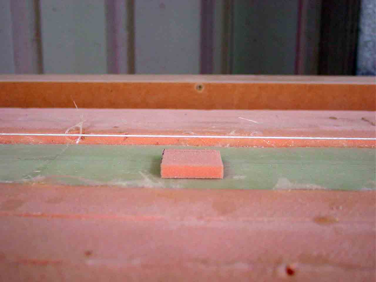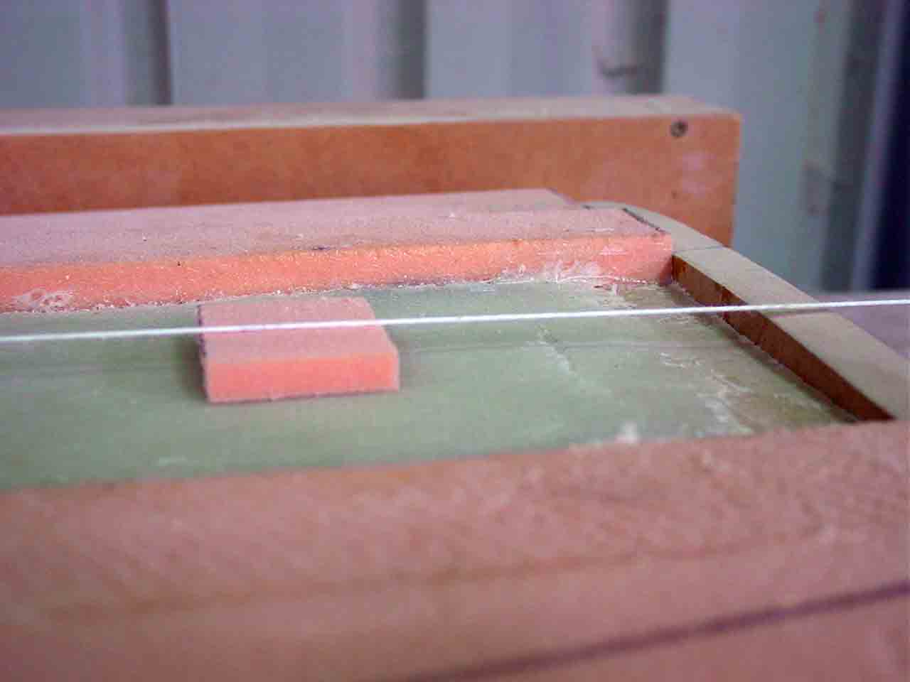 I then ran a stringline down the spine to ensure that the blank is level along its length. I set a spacer from the spine to the stringline at the ends (just touching) then ran it along the blank and you can see at the middle that the gap grows from just touching to 20mm, that is the sag in the unsupported blank. I will solve this with some blocks along the spine to ensure that the height is correct, being careful not to be too high and create a similar bow the other way. This is where stringlines are so easy to work to and easy to set up.