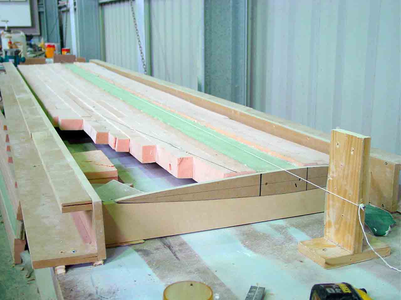 The second problem is that gravity is still having an effect on the shaping of the blanks. They are still flexible enough and long enough that being propped up at the ends it still falls about 20mm. The bench top is out by about 5mm in places so I don’t want to trust the shaping to the bench top. My solution is to suspend the blank by the ends in a cradle and then block the spine up in a couple of places to ensure it is level along its length.