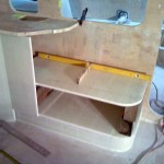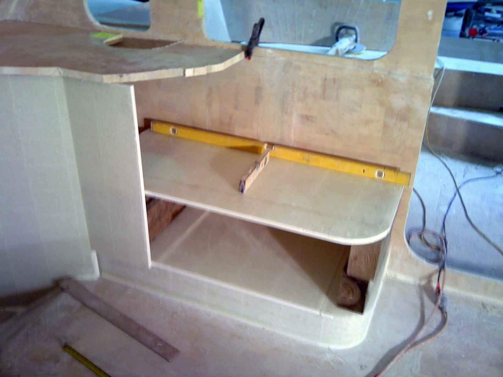 In order to have a removable shelf, I had to cut it yesterday, decore the edges and back fill them, which fortunately I did. So today I was ready to glass the 2 parts of the bottom shelf either side of the removable middle section, which today I did. And having a removable middle section meant I was able to reach in under the 2 parts of the shelves being glassed in and glass the underside to the bulkhead and kickboard. Reaching in and under to cove upside down is not that easy in a confined space but is doable as is getting glass to stick upside down.