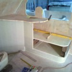 Tomorrow I might get another couple of hours done gluing and glassing the 2 sections of 25mm polycore together to make a panel big enough to cut the bulkhead from. As I did last time, I will need to decide if I have the join going horizontal or vertical, last time I chose horizontal and will probably go the same way this time. The bulkhead wont be as wide as the starboard one, because this bulkhead will be square to the centreline not on an angle, but I dont think this will persuade me that joining it vertically will be better, as with the starboard hull, a lot of the joins will be hidden inside the cupboards either side of the doorway leaving only a small section each side visible that will need fairing. If I do get a couple of hours tomorrow, it will mean I have managed 62 hours on the build this month, which isn’t too bad considering I was away for the boat show for 8 days.