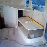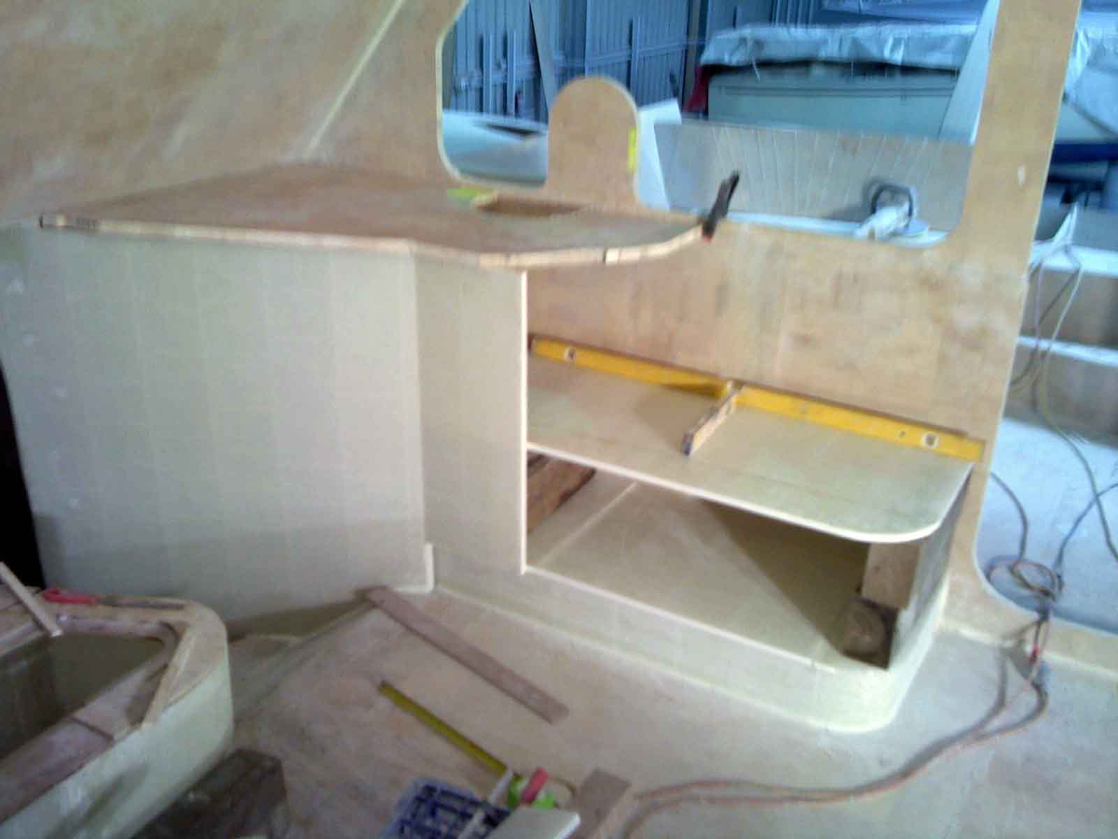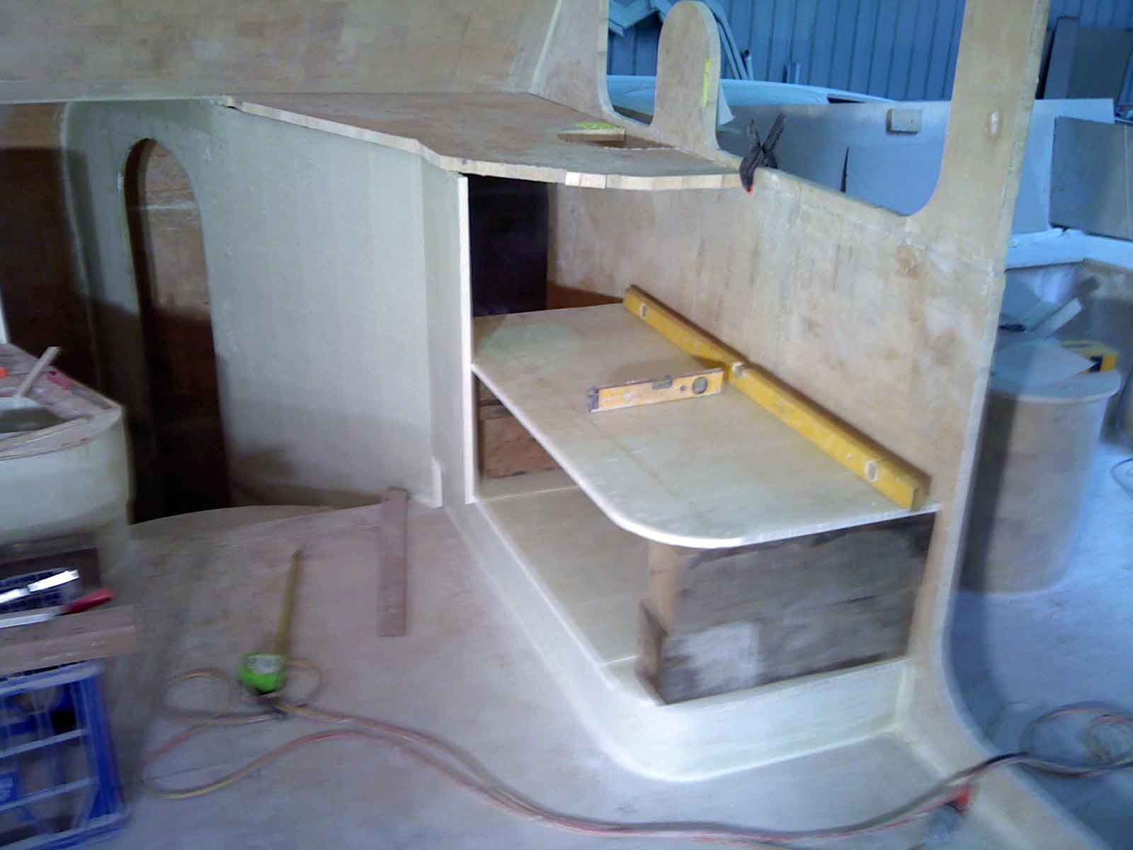 I also got the 25mm duflex offcut from the window cut-out and started to make the top from it. It will need another part glued and glassed together to form the entire top but I plan to have a hinged section at the doorway end of the top, which will form a lid that opens up to house the plotter screen when not in use. Its a big screen and is somewhat obtrusive when not being used, so housing it under the bench top when at anchor will serve 2 purposes, besides storing it out of sight and out of the way, it also hides it from view to again stop thieves from being tempted to break in to steal it if we are away from the boat for any extended time. I hope I dont sound too paranoid. An once of prevention and all that. The anti theft is a bonus and not the primary motivation.