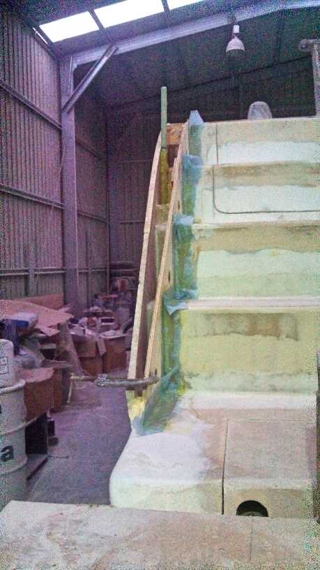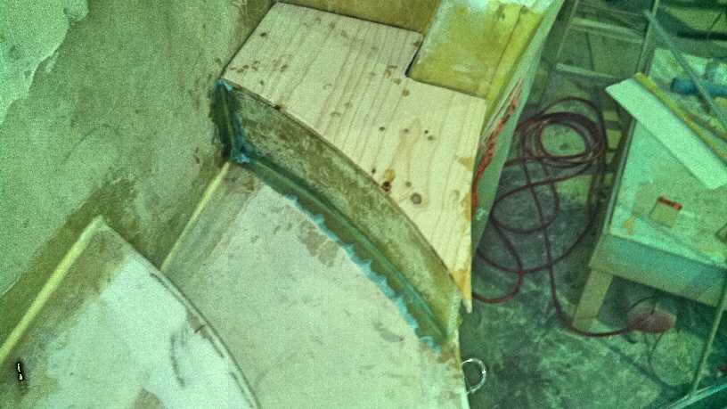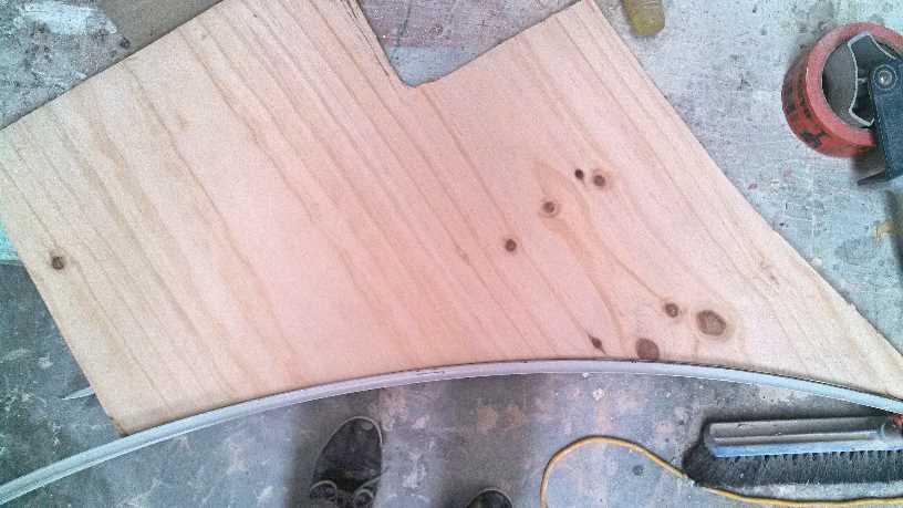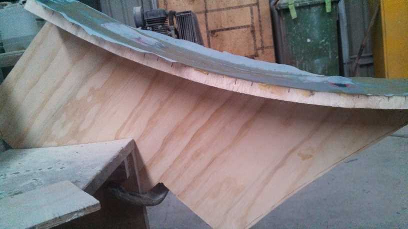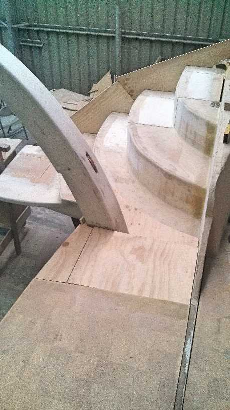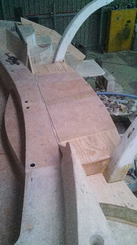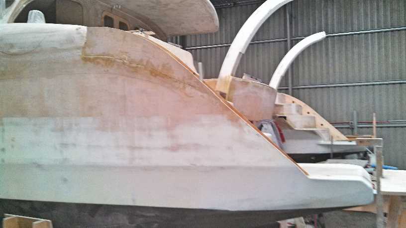 Next job is to make the curved (and flat for the bottom third) top of the void between the step and hull sides. The curved section will probably be kerf assisted ply, tortured around the bend and glued down and glassed down. The top will probably be 2 ply thicknesses thick (so 2 x 12mm ply) or maybe even 3. I will probably need to fit and create the curved tops by placing a plastic sheet between the side panels and the top to stop it getting stuck down while the kerfs and multiple panels set to each other. Once set they retain their curved shape so I can work on the underside to fit the stainless steel cleat plate before putting the tops back on and glassing it all down ready for final shaping (rounding the edges) and fairing.