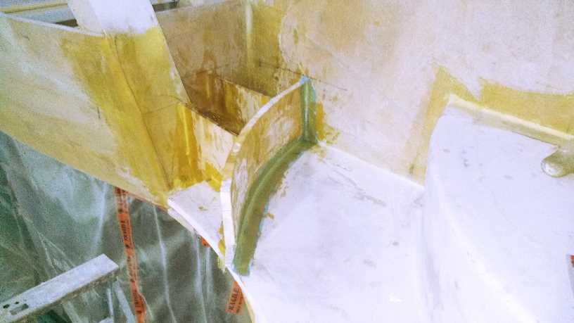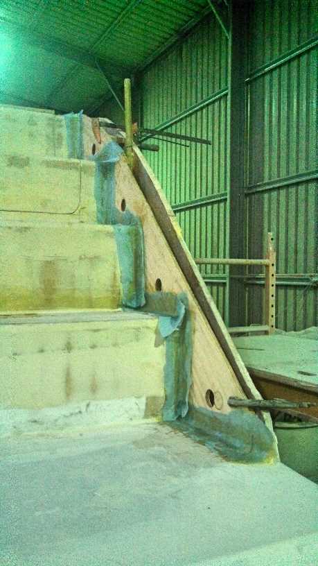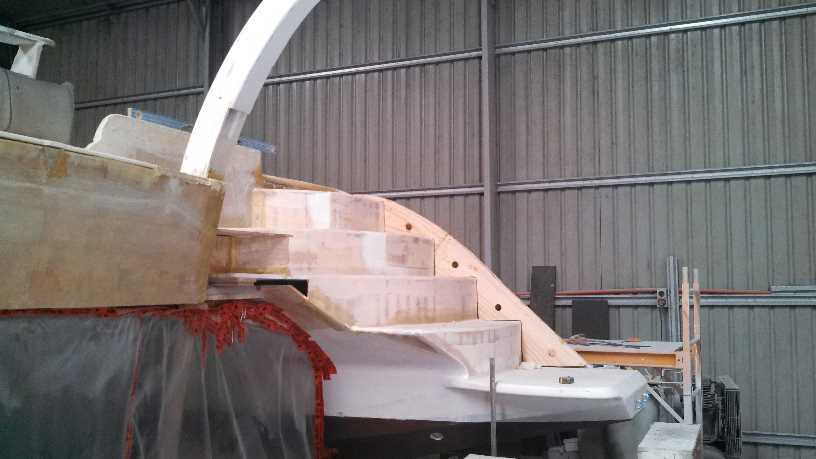 The next day I dry fit the fronts and tops to ensure the curves matched, then made webs that would form a platform for the step tops and also the fronts to be glassed against and also to act as further strengthening of the davits to the bridgedeck. In order for the davits to break or move they have to break all of the glue and glass and now also the webs that are glassed to the bridgedeck and over the davit bases. Thats a lot of strength.