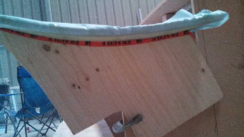 Then using the curved step edge as the mold I shaped the step fronts (risers). For one of them I used the only piece of duflex big enough left and cut kerfs on the inside of the curve and in this case the outside of the step, glued it and glassed it in the mold and peel plied it. The other front is made from an unglassed polycore offcut. I glassed each side on a table and peel plied them, then, whilst still wet, I attached it to the step edge mold. This method created a few bubbles in the glass. I did my best to remove the ones on the outside face, but any still there when set will get ground out before fairing, any on the inside face will get enclosed in the sealed void once the step top gets glassed on so I wasnt too concerned about them.