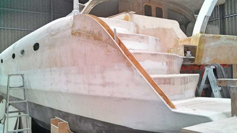 The boat is nearly completely closed. What that means is that the core will soon be completely enclosed by glass or filler everywhere on the build, exterior at least as there is still a little work on interior furniture which isnt yet closed. But the hull or any part of the exterior will have no exposed core (mostly balsa but also ply and polycore) and provided I continue to follow through core rules it will remain that way. The rule is wherever anything needs to go through the core, such as bolts etc, then the hole is drilled oversize, back filled with glue/filler and re-drilled the correct size, thereby maintaining the core seal. The only sections still to do are a small patch each side where the hull meets the bridgedeck at the top of the new middle steps under each davit step and the insides of the entire step/hull sides that I have almost completed.