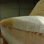 Once I decided the shape was good I cut the glass to size ready to wet it out, then starting at the bow (for no particular reason) and working back I wet it out. It is better to work from one end to the other rather than from the middle out to the ends unless you have 2 people glassing and even then I would recommend each starting at the ends and meeting in the middle, that way the meeting is of fresh wet resin not wet onto partially green resin, especially in hot weather. Some people use rollers, I prefer just a 60mm paint brush. You are wetting out on a horizontal surface so you are bound to have drips and spills, you simply cannot avoid it and I find it easier to control or clean drips with a brush. I also recommend you put something on the floor to drip onto. I put the mdf sheets down, its easier than cleaning the floor later.