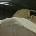 The shape I wanted from the bogged section looked perfect with the glass on dry. The curves and lines in all directions looked fair. Regular readers will know that once the glass is wet it becomes opaque and the surface below becomes visible again. Once I had wet the glass I could see the imperfections in the panel and that more work and bog would be needed to get it fair.