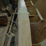 I didn’t spend much time today actually working on the boat. The bog was not yet set enough to sand so I did a little more work preparing the forebeam for gluing together and the rest of the time cleaning up the mess I made making the strips down the port side of the boat. I will need the space clear to work on the inside of the planked panel but I include cleaning up in the work hours of building the boat as it is a necessary task to completion.