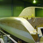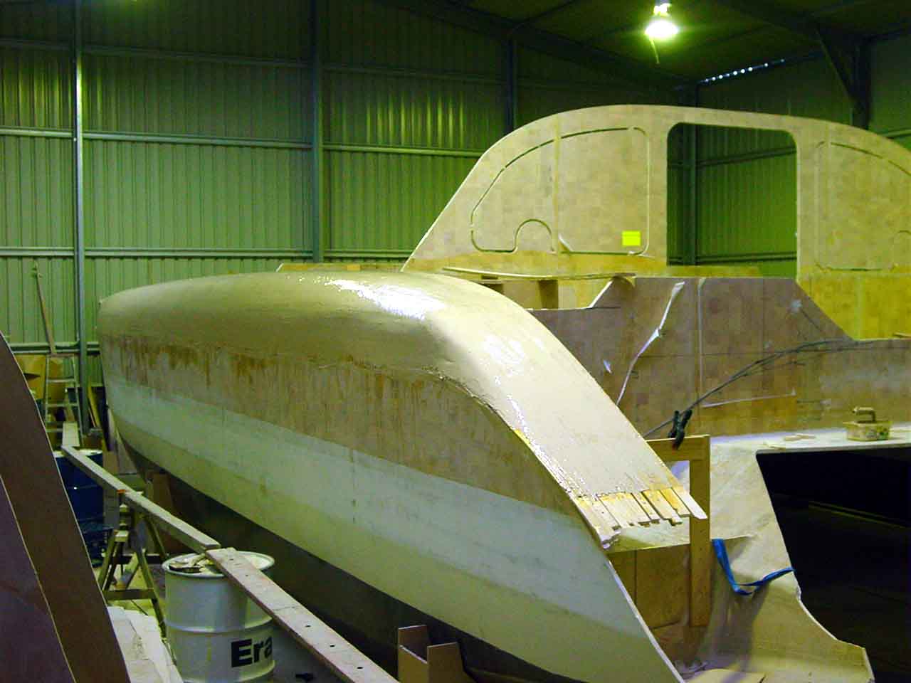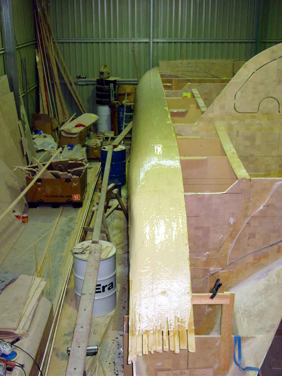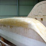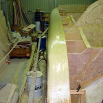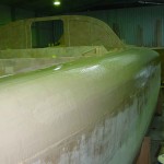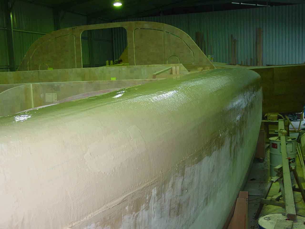 Once the glass was wet out had gone a little green (tacky but effectively set) I scraped a thin layer of fairly sloppy bog on. This meant a long 2 hour lunch. It meant that the glass would not move under when I trowelled on the bog but I would still get a chemical (molecular) bond. Again I started at the bow and worked to the stern. I scraped up any runs that had run onto the hull panel below as I went and then once I had finished a thin layer all over I used the last of the mix I had to fill any obvious low spots. This layer of bog is basically to just fill in the grain of the glass as most of the panel should be pretty fair, and then more bog can be added to the low spots. A lot of people believe this is double handling and that it is just as easy to put a thicker layer of bog on, but I think sanding it off is harder so I prefer the thin layer method. I had it drummed into me (and you should take note of previous builders advise) that weight is the enemy so I put the minimum bog on I can get away with, and then if I need more then I add it, but more compelling is that I hate to sand the stuff back off again!