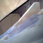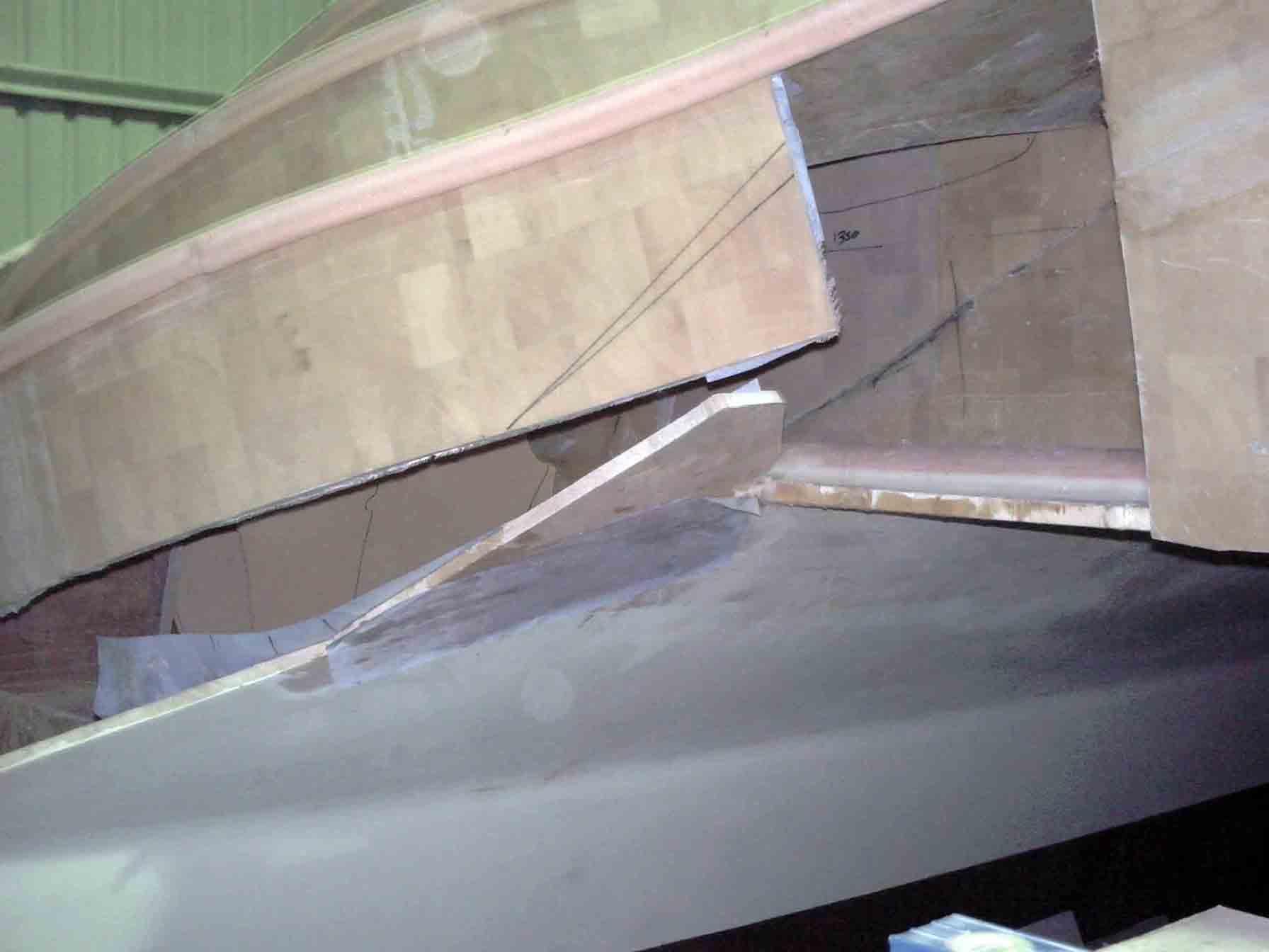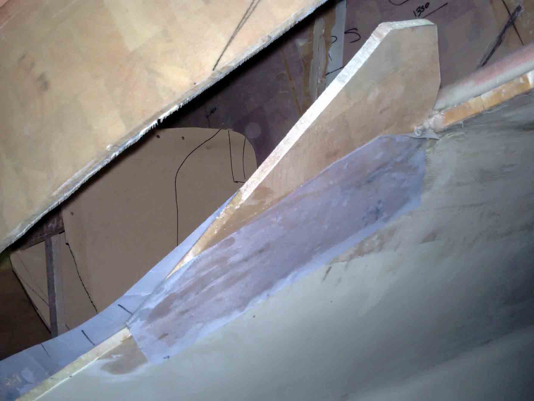 Anyway, whilst progress has been slow it is progress nonetheless. With the steps in place on the port hull I made a piece to fill the gap under the transition step to the hull side. You simply cut a piece to fill the gap and make 2 of them and glue and glass them on. I have confidence to make a mirror image part and glue and glass it onto the starboard hull because I know the hull is an exact mirror of port and the steps have been made as exact mirrors also.