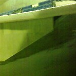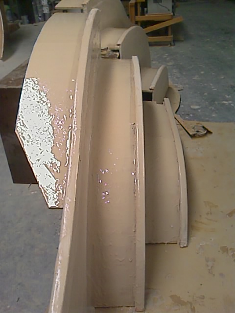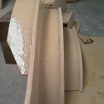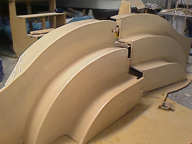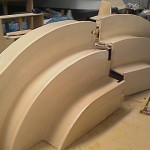 I wrapped the glass all the way around from the step tread around the foam front and wrapped around behind the foam front and I used wedges to keep the glass hard up against the back of the foam front. Once I had all 6 edges (3 step fronts on each set) glassed I had a break for late lunch while they tacked off a little further. I then started bogging the steps with a thinnish bog mix and applied it with a brush. I also ran bog on the step risers that are kerfed so they have a series of flats that need to be rounded to a curved finish and finally the step treads. There are tapes and z joins that need to be faired out on the treads.